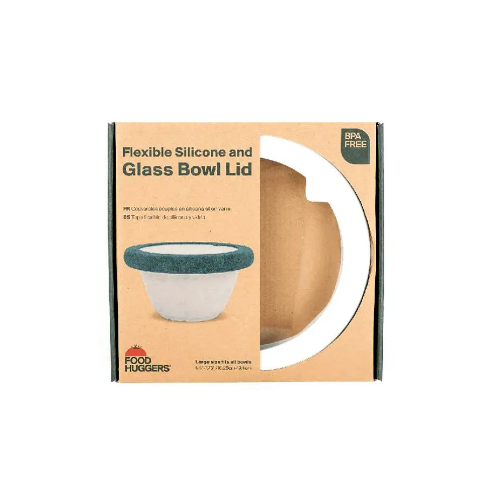 Witte deksel van glas en silicone. Voor grote kommen. Sluit stevig af, stapelbaar en herbruikbaar. Minder rommel, minder verspilling.