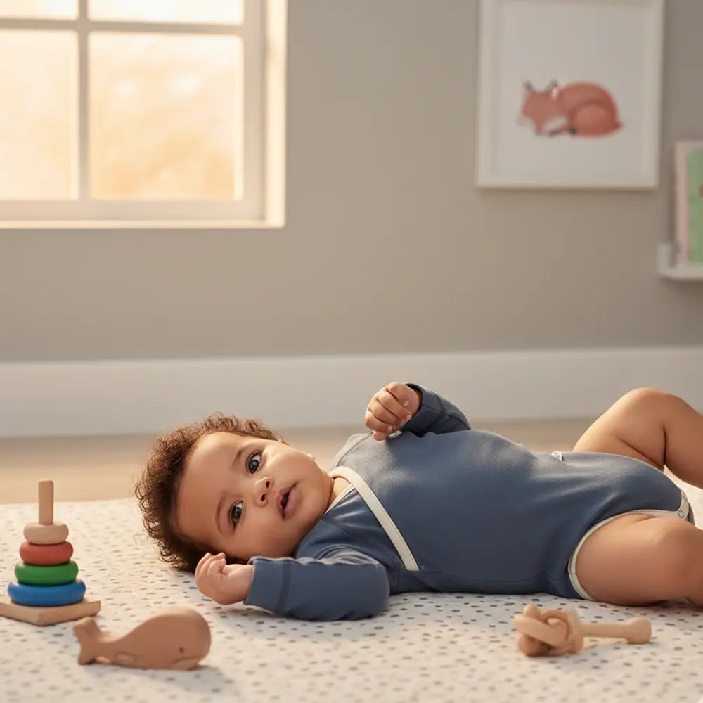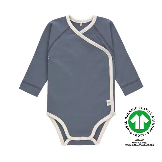 Blauwe romper van biologisch katoen. Overslag in kleine maten, drukknopen voor gemak en comfort.